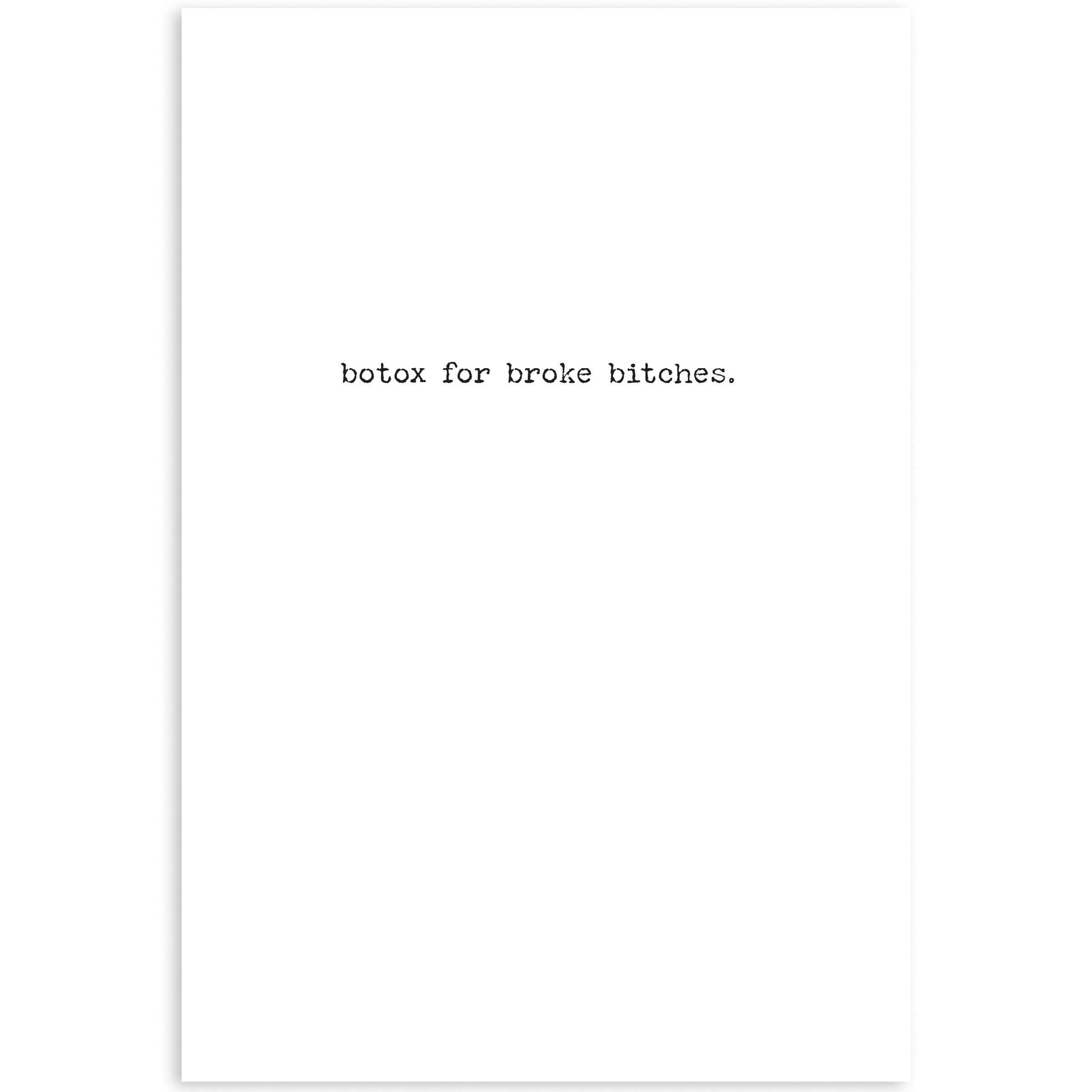 A greeting card from our Trash Talk By Annie Collection displaying a vintage black and white photograph complemented with a humorous sentiment. Greeting card features "Bangs..." sentiment on the outside and "Botox For Broke Bitches." sentiment on the inside with space to add a personalized message. Our Bangs greeting card is a hilarious gifting option for everyday moments. Proudly made in the USA.