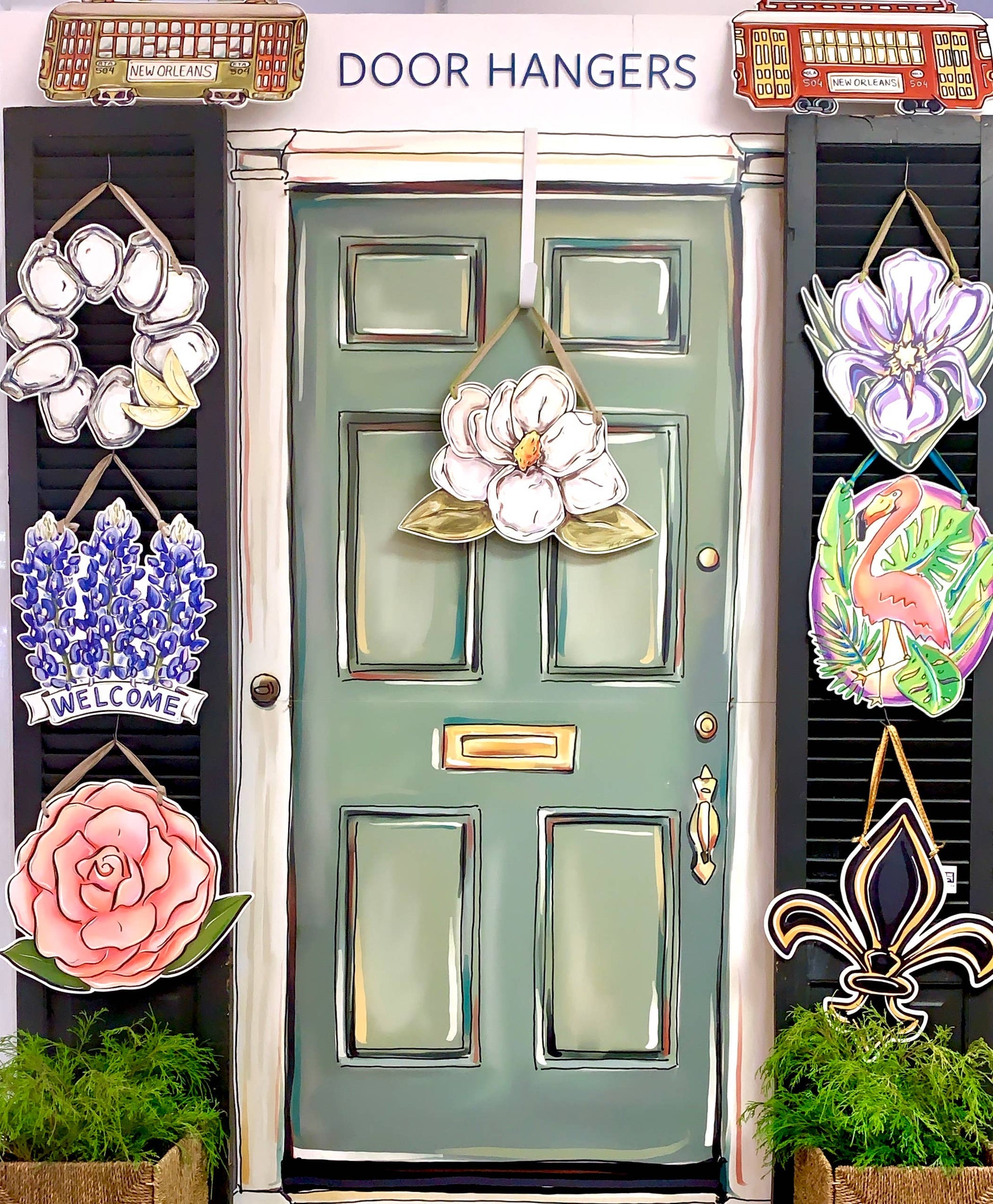 Door hanger measures 15.5 IN wide x 21 IN tall x 1/4" thick. Hangs approximately 24 IN tall with ribbon.