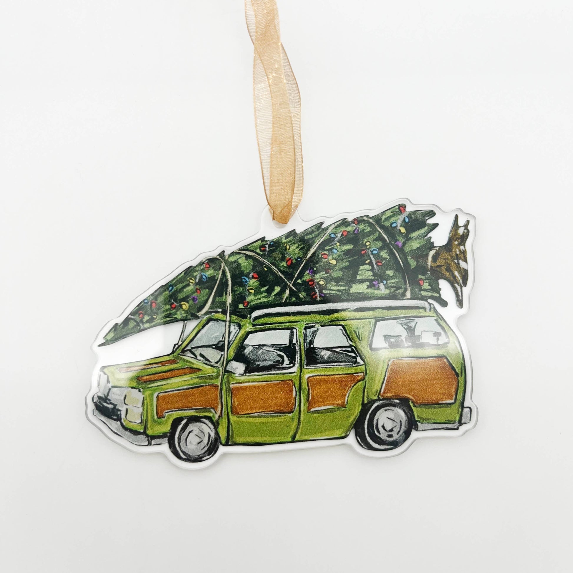 Cuddle up with hot cocoa, sugar cookies and a classic Holiday movie, because this cute green station wagon with wood side paneling and a Christmas tree on the roof will be the perfect addition to your tree.