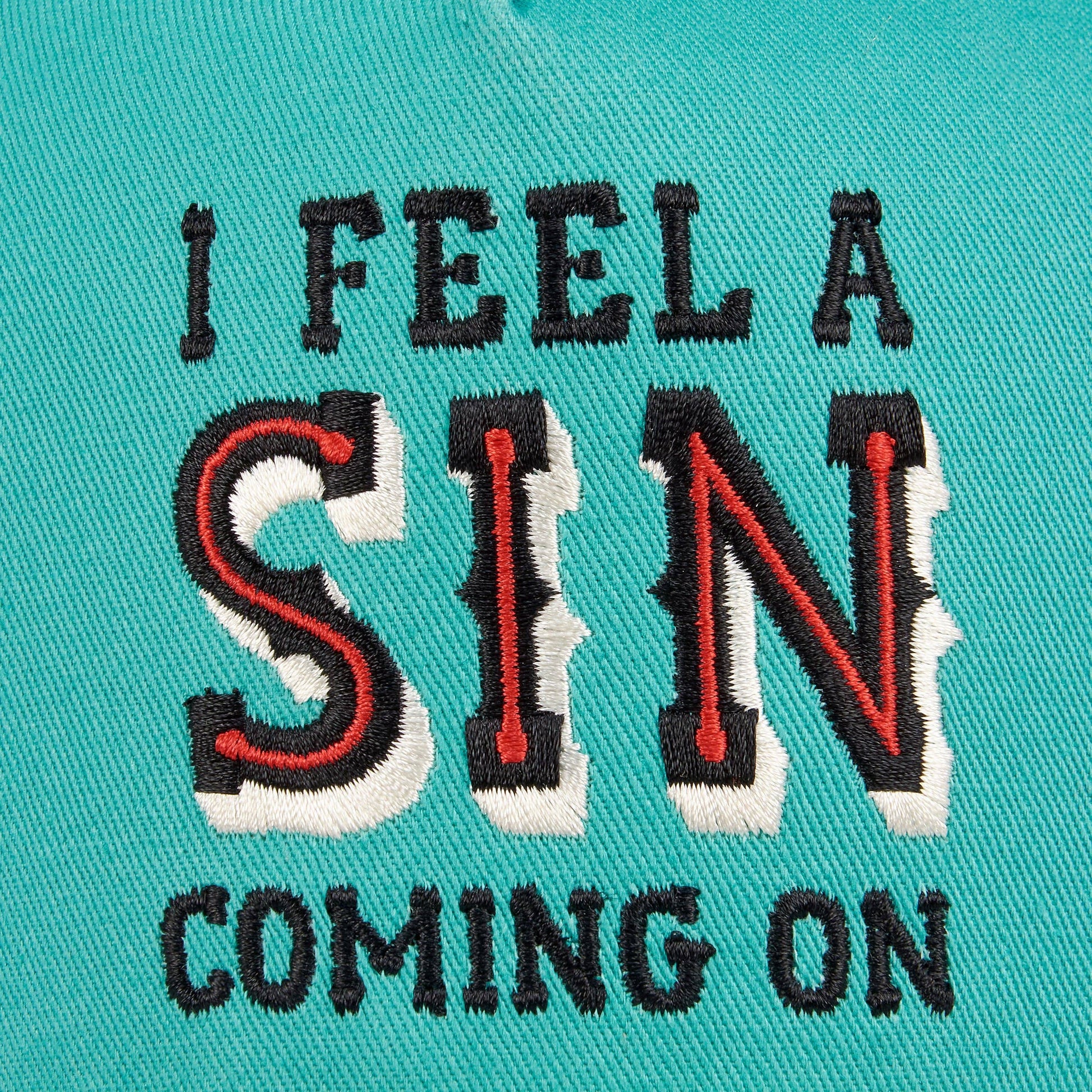 A cotton trucker hat from our Western Collection displaying a fun western inspired sentiment that reads "I Feel A Sin Coming On" replicated from original hand illustrated art. Western design is embroidered on teal blue cotton for added texture with a coordinating cream color cording accent. Our I Feel A Sin Coming On trucker hat is one size fits most with an adjustable snap closure to create the perfect fit and full mesh back for comfort and breathability in hot weather. Hand wash only. A fun western-themed accessory perfect for gifting.