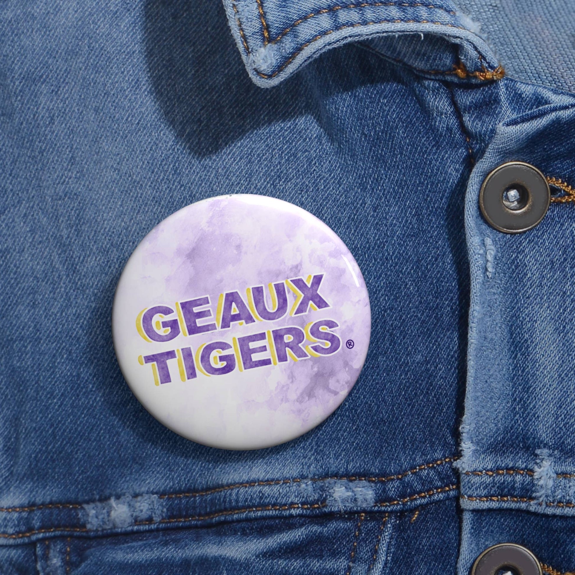 OFFICIALLY LICENSED BY LSU 2.25 round game day button with a pin on the back. Perfect to show your Tiger Pride!