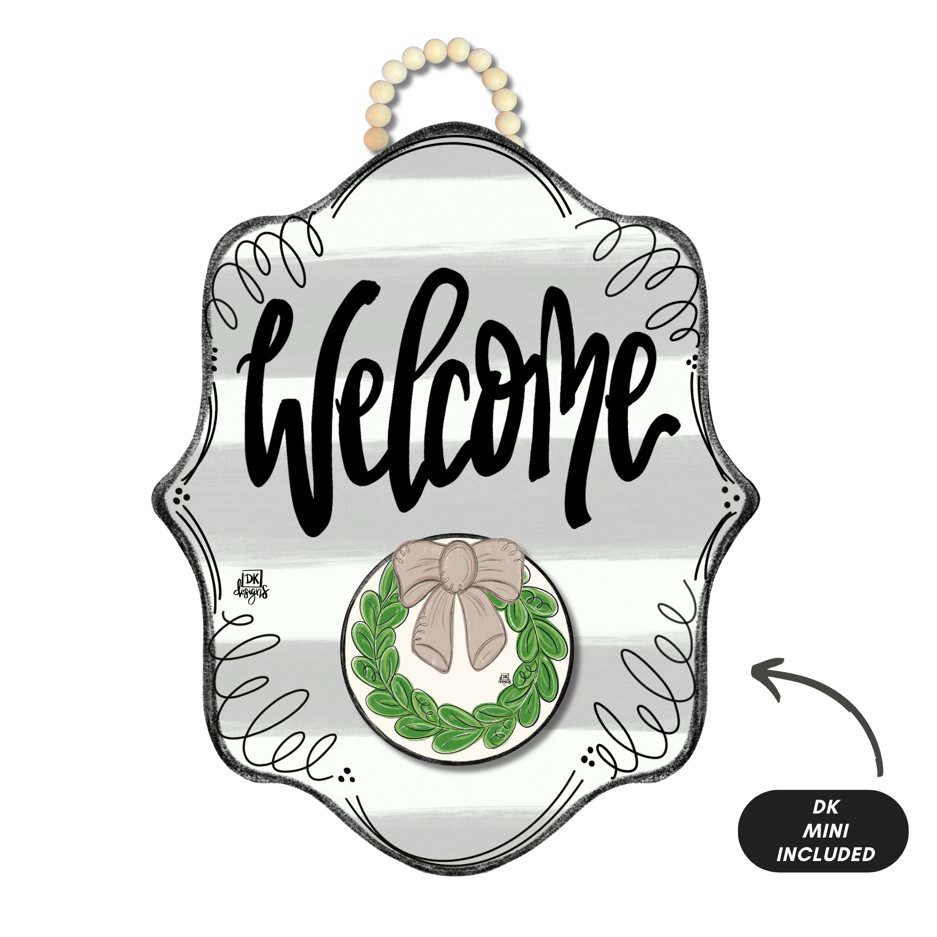 The White Bloom "Welcome" Hanger + Mini is the perfect “jewelry” for your door! Show off your style with a beautifully designed door hanger featuring a "Welcome" message on a stripped grey and white backdrop. Included is a removable DK Mini that Velcro’s on and off for easy seasonal or style changes.
