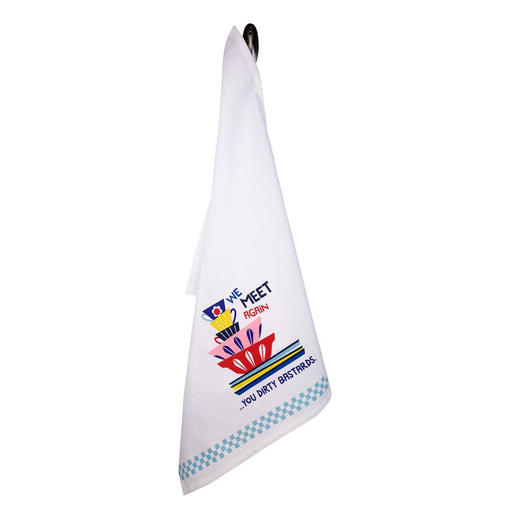 Honestly, it doesn’t matter if this is the 47th mug of the day or the same plate your spouse “forgot” to rinse (again), this tea towel understands the never-ending saga of dirty dishes. With a white background and a cheerful stack of pink, red, and mustard-yellow cups, it’s deceptively charming until you read the bold text: We Meet Again... You Dirty Bastards.